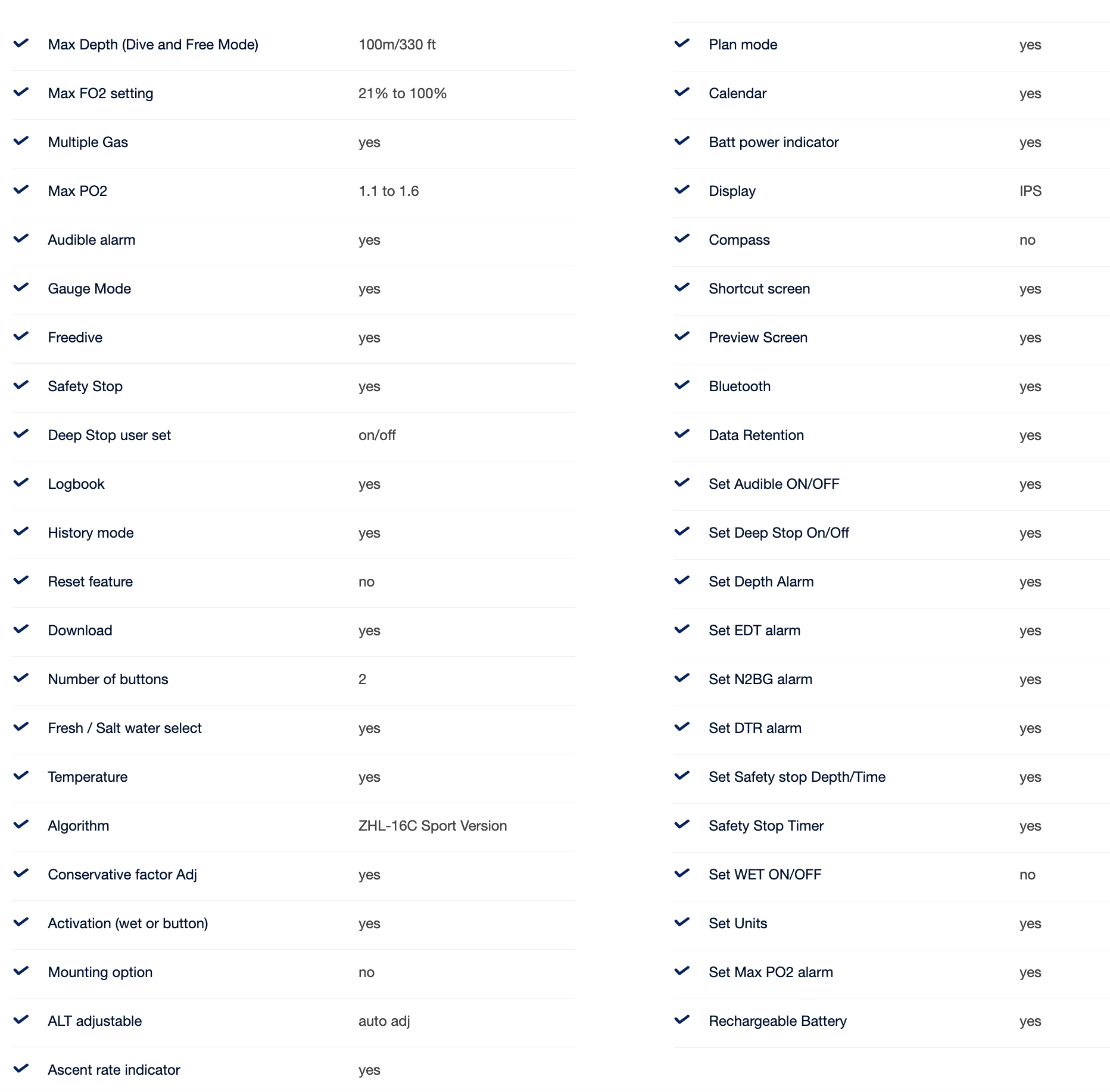- Historiemodus registrerer de siste 24 dykkene. 4 driftsmoduser: Luft, Nitrox, Måler (med løpetidtaker) og Fridykking (sporer beregninger for å tillate overgang mellom Dykke- og Fridykking).